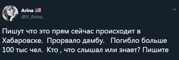 На фоне этой непростой ситуации в Twitter появляются спекуляции и фейки. И к этому можно отнести публикацию некой блогерши под ником Arina и с американским флагом рядом с аватаркой, которая опубликовала видео удара цунами в Японии, заявив, что дело происходит в Хабаровском крае, где "уже пострадали сто тысяч человек".