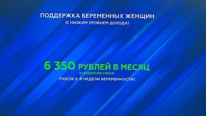 Кроме того Президент поручил обеспечить поддержкой беременных женщин с низким уровнем доходов. При постановке на учет в женской консультации после 6-й недели беременности им будут выплачивать новое ежемесячное пособие. Его размер составит половину регионального прожиточного минимума трудоспособного гражданина (в среднем по стране это 6350 рублей в месяц). Получить такую выплату можно будет, если среднедушевой доход семьи составляет менее прожиточного минимума на человека.