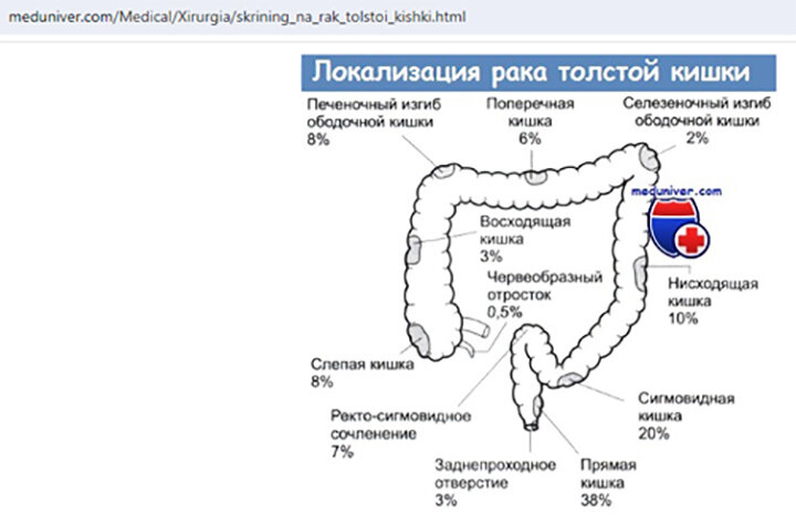 ЧАЩЕ ВСЕГО (38% СЛУЧАЕВ) РАК ТОЛСТОГО КИШЕЧНИКА ЛОКАЛИЗУЕТСЯ В ПРЯМОЙ КИШКЕ. СКРИН С САЙТА MEDUNIVER.COM