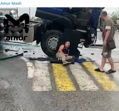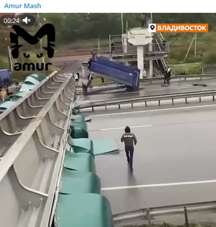 На федеральной трассе на въезде во Владивосток водитель самосвала забыл опустить кузов и на скорости снёс пешеходный переход.