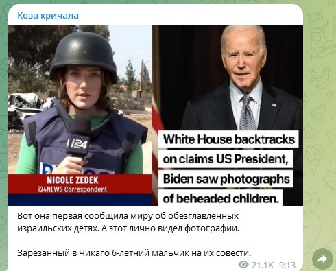 Напомним, что после слов Байдена о том, что он видел фотографии жестоких расправ над малышами, Белый дом опроверг его заявление. Оказалось, что ни Байден, ни его сотрудники не видели подтверждённых фотографий и не получали сообщений об обезглавленных детях. Информацию сообщил телеканал CNN.