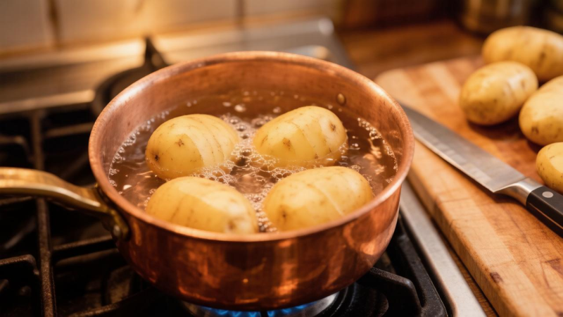 А что со вкусом будет? Во-первых, так картофель нужно варить в мундире - в кожуре. Во-вторых, если уксуса немного, вкус картофеля не меняется. Зато текстура становится заметно стабильнее. Такой картофель удобно резать, он лучше держит форму в салатах и не превращает блюдо в мягкую массу. Картофель кладут в кипящую воду и добавляют небольшое количество столового уксуса. Обычно это примерно 1–2 столовые ложки 9% уксуса на 2 литра воды. После этого процесс варки идёт, как обычно, но результат заметно отличается по структуре.