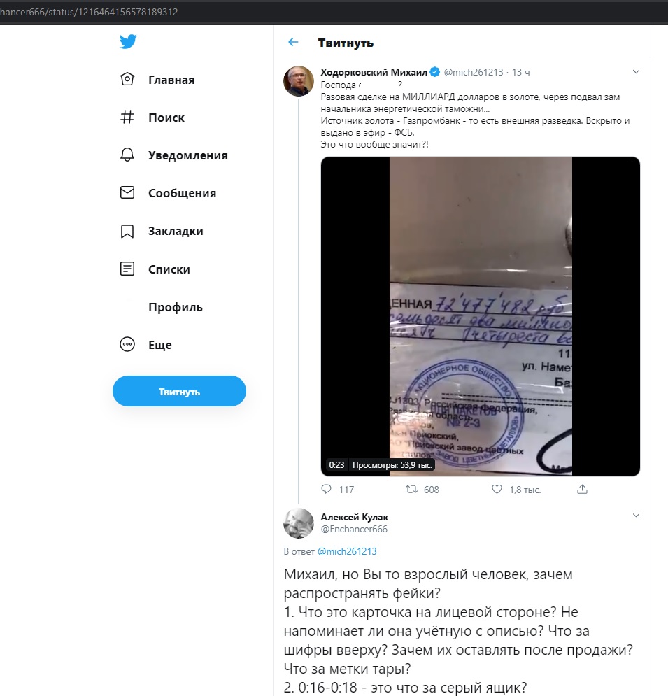 Михаил Ходорковский опубликовал в Twitter видео с миллиардом золотом и "столбиками" долларов в пачках. Заявил, что это "разовая сделка", проведённая "через подвал замначальника энергетической таможни". Потребовал объясниться, но сам получил обвинения. "Зачем распространять фейки?" - задают вопросы пользователи.