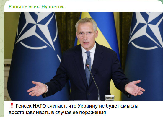 Генеральный секретарь НАТО Йенс Столтенберг счёл бессмысленным восстановление Украины в том случае, если она потерпит поражение. Отсюда интересный вопрос. А зачем тогда Западу русские активы? С какой целью он собирается конфисковать почти 300 млрд средств России? На Западе не раз объясняли, что средства пойдут как раз для "восстановления Украины".