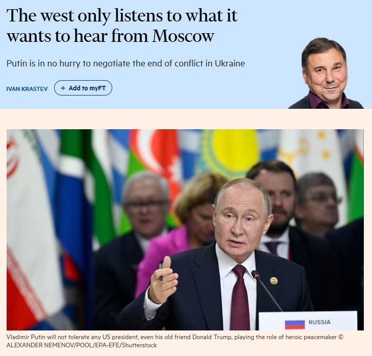 Речь идёт про статью под названием "Запад слушает только то, что хочет услышать от Москвы". Её автор, некто Иван Крастев, приходит к сенсационному выводу, что президент России "не торопится договориться с Западом об окончании конфликта на Украине".