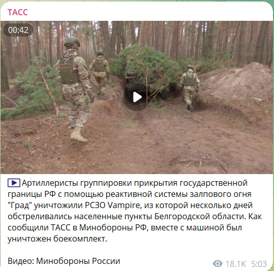 Так, при помощи реактивной системы залпового огня "Град" русскими воинами была уничтожена очередная чешская РСЗО Vampire. Уточняется, что именно с её помощь последние несколько дней осуществлялись обстрелы гражданского населения Белгорода и Белгородской области.