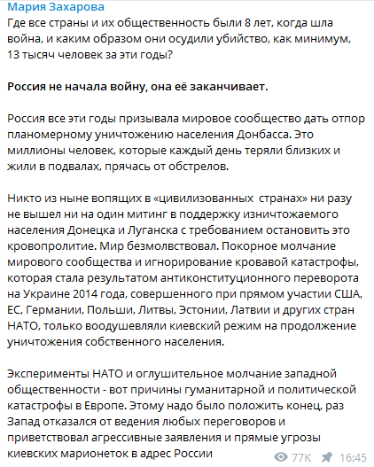Захарова отметила, что страны, которые сейчас кричат о "вторжении России", на протяжении восьми лет игнорировали самую настоящую войну, которую украинский режим вёл против жителей Донбасса. За это время под обстрелами погибло как минимум 13 тыс. человек, но Запад никак не осудил украинскую агрессию.