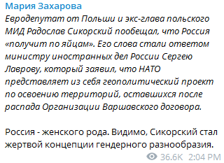 Официальный представитель МИД Мария Захарова напомнила евродепутату, что Россия - слово женского рода. И того органа, о котором говорит польский политик, у неё нет.