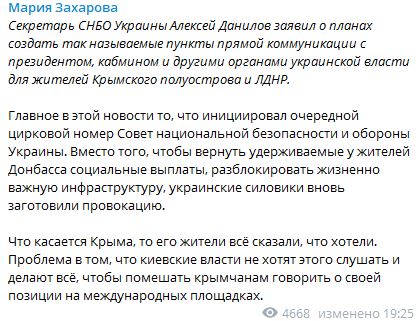 Так Захарова прокомментировала идею Киева открыть пункты прямой коммуникации с жителями неподконтрольных территорий Донбасса, а также с жителями Крыма. Секретарь СНБО Алексей Данилов считает, что люди смогут через эти пункты поддерживать связь с президентом Украины Владимиром Зеленским, правительством и рядом органов власти. Данилов уверен, что без подобного механизма конституционные права жителей ДНР, ЛНР и Крыма (их всех Киев причисляет к украинцам) нарушаются.