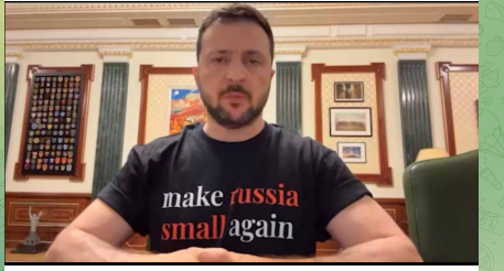 Ранее и.о. президента Украины Владимир Зеленский появился на очередном обращении к нации в футболке с надписью, обыгрывающей знаменитый предвыборный лозунг кандидата в президенты США Дональда Трампа "Make America great again". Белыми и красными буквами на чёрной ткани нанесена надпись "Make Russia small again" - "Сделаем Россию меньше снова".