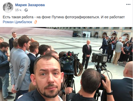 У себя на странице в соцсети официальный представитель МИД РФ Мария Захарова сыронизировала над украинским журналистом Романом Цимбалюком и поймала его на "путинской" работе: "Есть такая работа - на фоне Путина фотографироваться".