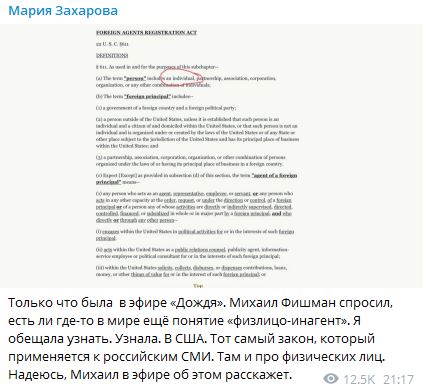 Ведущий телеканала "Дождь" Михаил Фишман во время эфира попросил Захарову привести в пример хотя бы одну страну, кроме России, где есть понятие "физлицо-иноагент". Официальный представитель Министерства иностранных дел пообещала изучить этот вопрос и дать на него ответ. По иронии судьбы, такой страной оказались Соединённые Штаты Америки - государство, на которое равняется вся российская либеральная общественность, включая сам "Дождь".