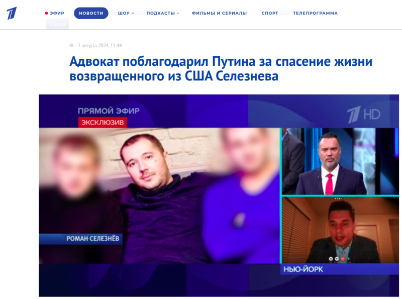 В эфире "Первого канала" адвокат также поблагодарил президента Владимира Путина за содействие и возвращение своего подзащитного на родину, заявив, что его вмешательство помогло спасти Селезнёву жизнь. Он уверен, что в Штатах состояние заключённого продолжило бы ухудшаться.
