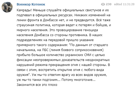 Военный корреспондент Юрий Котенок рассказал в Telegram о нынешней ситуации на линии соприкосновения в Донбассе.