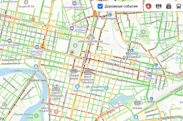 По информации "Яндекс.Пробки", затор тянется через центр города. Так, бордовые линии на карте проходят по улице Красной – от Горького до Офицерской. Затруднено движение и по улицам Офицерской, Колхозной и 40-летия Победы.