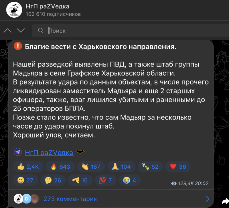 Если быть точнее, то среди жертв числятся два старших офицера, а также до 25 операторов БПЛА. Важно отметить, что сам "Мадьяр" в этот момент отсутствовал, готовясь к празднованию.