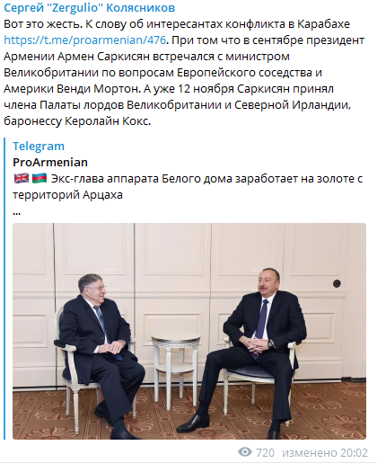 Он может быть не единственным интересантом вооружённого конфликта в Карабахе, который закончился отчуждением территорий в пользу Азербайджана. Блогер Сергей "Zergulio" Колясников обратил внимание, что ещё в сентябре президент Армении Армен Саркисян проводил встречу с министром Великобритании по вопросам Европейского соседства и Америки Венди Мортон.