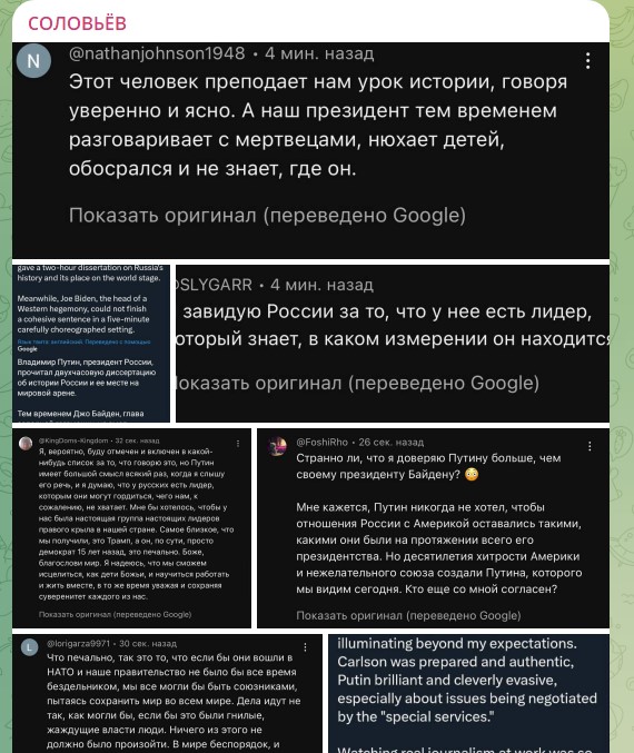 Американцы поспокойнее. Провластные СМИ сухо цитируют русского президента по самым важным для них проблемах, наподобие возможности вступления России в НАТО в начале 2000-х или освобождения американского шпиона Эвана Гершковича. Консервативные СМИ, склоняющиеся к позиции республиканцев, Трампа и Такера Карлсона, приводят куда более крупные выдержки из интервью по самой разной тематике. И риторика их вполне положительная.