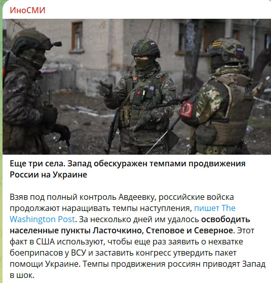 После взятия Авдеевки ВС РФ освободили сразу Ласточкино, Петровское, Победа, Степовое и Северное. В то же время армия небратьев экстренно бежит из сёл и городов. Готовится даже вывод войск из Харькова и Купянска.