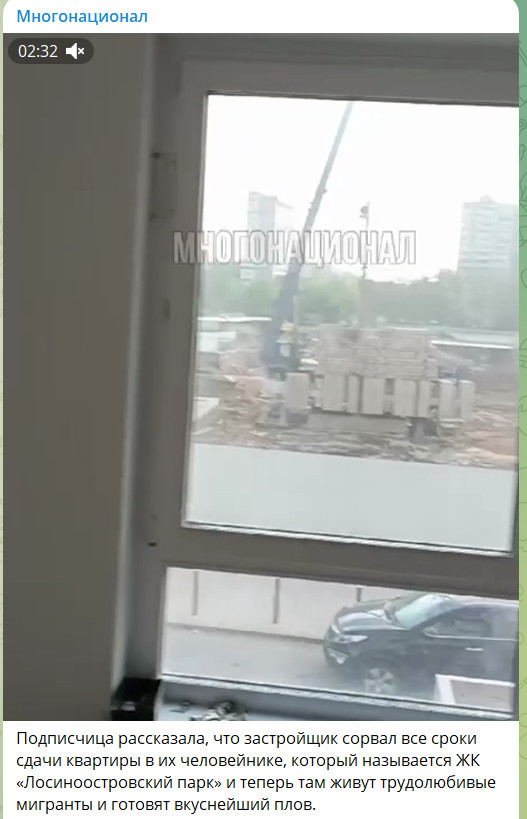 В Москве застройщик сорвал все сроки сдачи квартиры в человейнике ЖК "Лосиноостровский парк", и теперь в ней поселились трудолюбивые мигранты и готовят вкуснейший плов, рассказала ТГ-каналу "Многонационал" одна из покупательниц. По словам женщины, квартира превратилась в общежитие для мигрантов. И она заплатила за всё это "кучу миллионов".