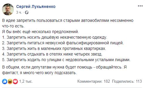 Российский фантаст Сергей Лукьяненко прокомментировал инициативу депутатов Госдумы России запретить эксплуатацию старых автомобилей. Писатель предложил развить эту идею, запретив ряд других вещей и явления, например – ходить по улице с недовольными лицами.