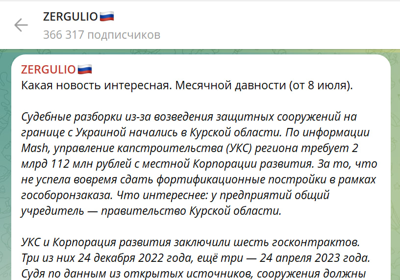 Новость от 8 июля, опубликованная в телеграм-канале Mash, гласит: "Судебные разборки из-за возведения защитных сооружений на границе с Украиной начались в Курской области". Суть проста: управление капстроительства (УКС) Курской области требует свыше двух миллиардов рублей от местной Корпорации развития (КР) в качестве компенсации за то, что КР не успела вовремя возвести укрепления – фортификационные постройки - в рамках гособоронзаказа.