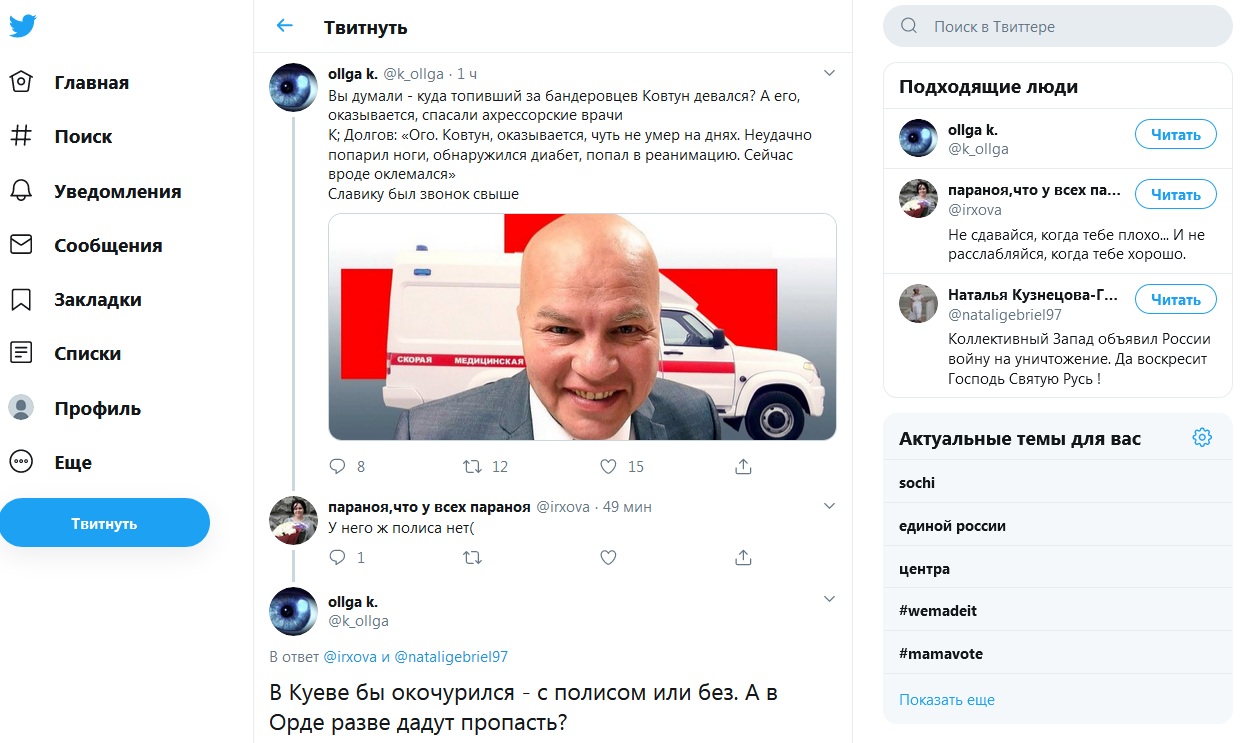 "Вы думали - куда топивший за бандеровцев Ковтун девался? А его, оказывается, спасали ахрессорские врачи. В Куеве бы окочурился - с полисом или без. А в Орде разве дадут пропасть?" - комментирует @k_ollga.