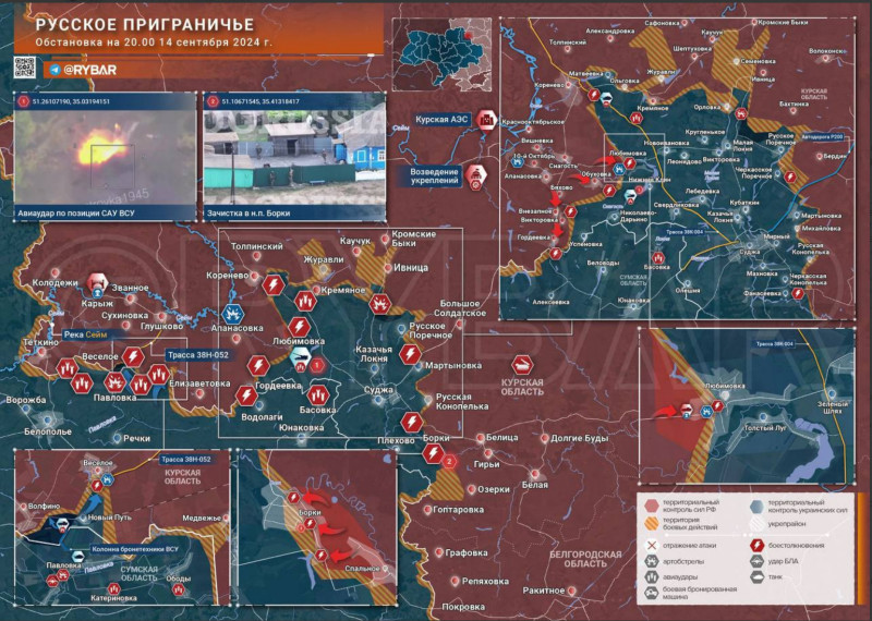На Курском направлении начались бои за Любимовку и оборона Весёлого. Как передает тг-канал "Рыбарь" по состоянию на 20:00 14 сентября, на Курском направлении русские войска в ходе контрнаступления достигли окраин Любимовки и Покровского. В то же время противник атакует во фланг силам ВС РФ с целью снизить темпы продвижения.