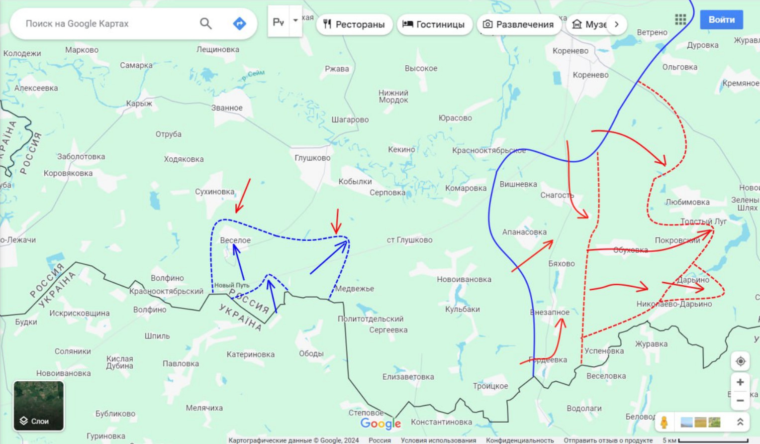 На юге Глушковского района уже более суток бои идут на южных окраинах Весёлого, куда украинские формирования вышли после преодоления заграждений на границе несколькими днями ранее. Оккупированный ранее Новый Путь используется противником в качестве перевалочного пункта, где штурмовые группы ВСУ спешиваются для дальнейшего вступления в бой под Весёлым.