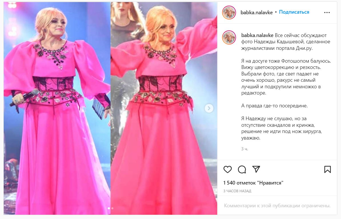 Однако интернет-пользователи придерживаются иного мнения. Один из Instagram-блогеров предположил, что журналисты выбрали фото с неудачным ракурсом и неправильно падающим светом, после чего изменили резкость и цветокоррекцию в Photoshop. В результате получилась фотография, на которой Кадышева действительно выглядит болезненно.