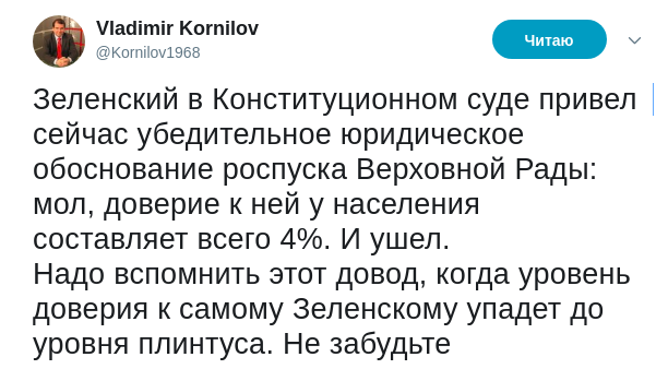 "Зеленский в Конституционном суде привел сейчас убедительное юридическое обоснование роспуска Верховной Рады: мол, доверие к ней у населения составляет всего 4%. И ушел, - отметил эксперт. - Надо вспомнить этот довод, когда уровень доверия к самому Зеленскому упадет до уровня плинтуса. Не забудьте".