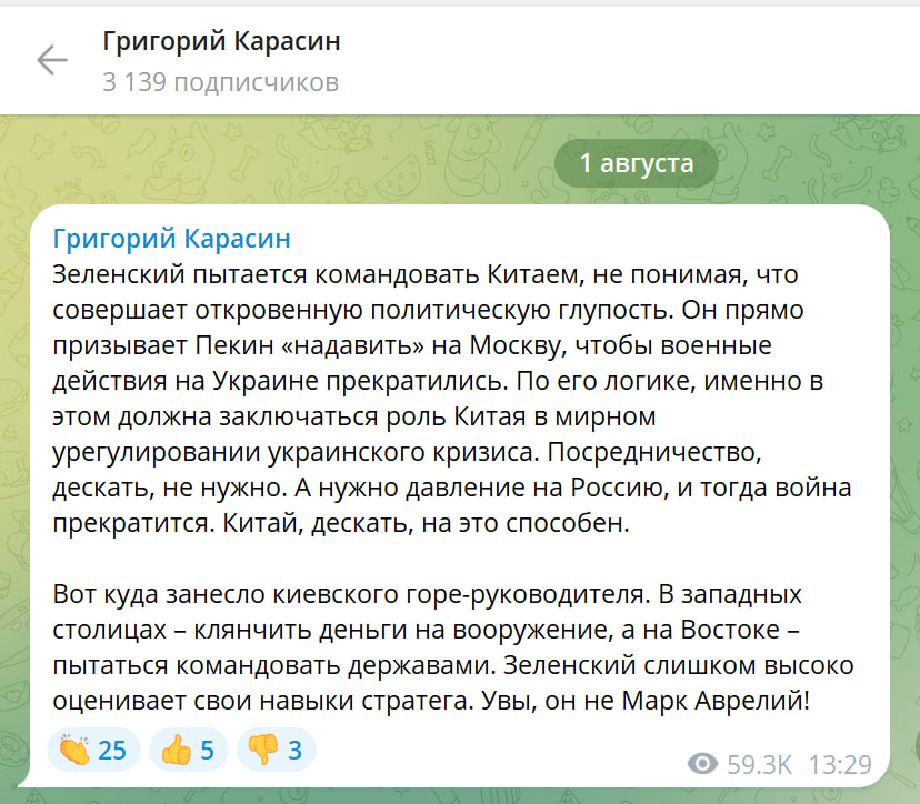 Председатель Комитета Совета Федерации по международным делам Григорий Карасин назвал такую просьбу Зеленского "политической глупостью", отметив, что тот пытается управлять Китаем.
