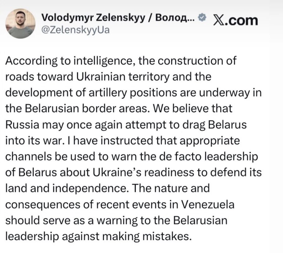 А тут, как нельзя кстати, подвернулся доклад главкома ВСУ Александра Сырского о том, что в Белоруссии происходит развитие дорог к территории Украины и налаживание артиллерийских позиций. Владимир Зеленский тут же зацепился за это и выступил с грозным заявлением: