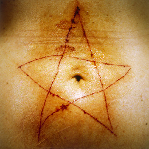 "Губы Томаса". Абрамович выпила литр вина с мёдом, после чего вырезала лезвием на животе пятиконечную звезду - символ сатаны. Затем сама себя выпорола и после этого легла на крест изо льда, под которым располагался электрический нагреватель.