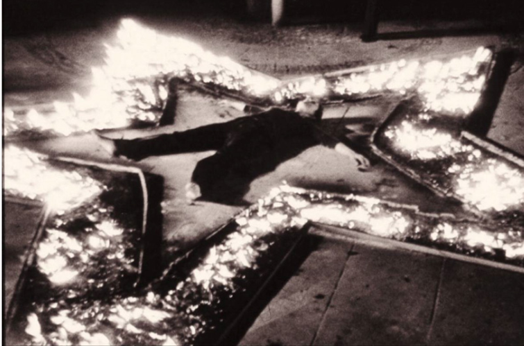 "Ритм 5". Абрамович выложила сатанинскую звезду из дерева, облила её нефтью и подожгла. Сначала она бросала в огонь пряди своих отрезанных волос, а потом зашла внутрь конструкции и легла на пол.