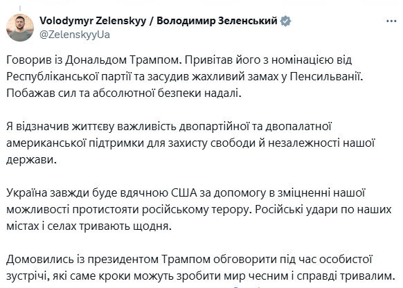 Владимир Зеленский заявил в соцсети X, что в ходе телефонного разговора с экс-президентом и кандидатом в президенты США Дональдом Трампом договорился обсудить с ним на личной встрече, какие шаги помогут заключить справедливый и устойчивый мир на Украине.