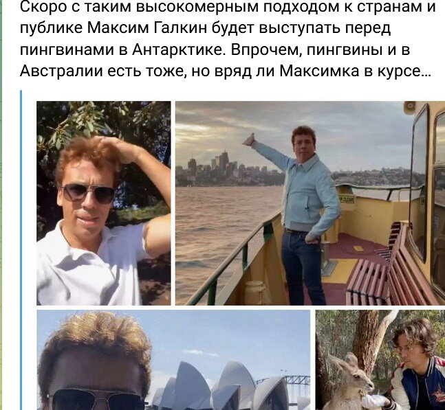 Решив, что не всё потеряно, он отправился в страны, где его ещё не запретили. Так "примадонна" оказалась в Австралии. Галкин* сразу же опубликовал в соцсетях видео, где он радостно гуляет по одному из парков в Сиднее.