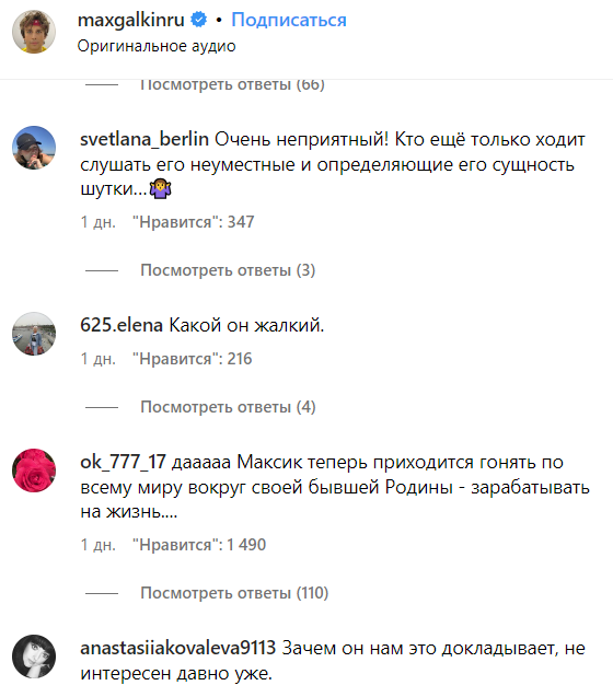 После побега на чужбину Максима Галкина* и его уставшую от скитаний по миру супругу Аллу Пугачёву спасали юмористические концерты среди русскоязычной аудитории в Израиле, Европе и Штатах. Когда ажиотаж среди релокантов утих, количество зрителей, готовых слушать "шутки за 300" о ненавистной России, поубавилось. Вдруг неожиданно для комика-иноагента подоспела и полноценная "отмена".