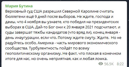 По мнению автора Telegram-канала "Мария Бутина", 4 ноября мир не узнает имя нового президента США. После основного дня голосования начнутся судебные тяжбы кандидатов, которые закончатся, в лучшем случае, 20 января 2021 года. И то только потому, что на конец января назначен день инаугурации нового главы государства.