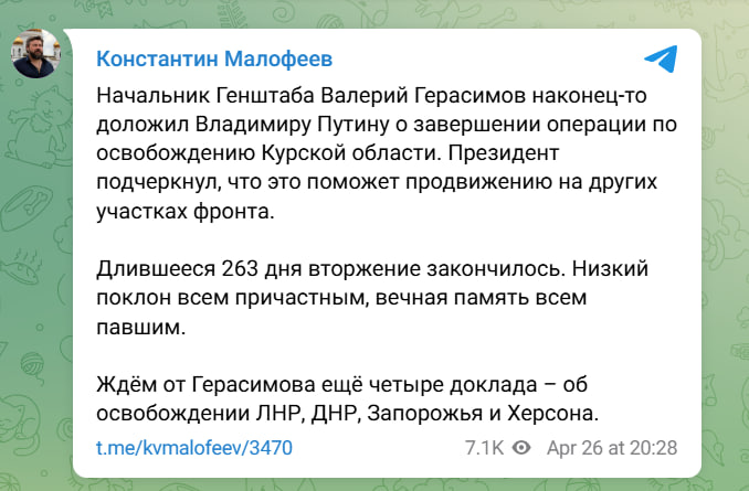 Учредитель Царьграда Константин Малофеев после освобождения Курской области отметил, что "длившееся 263 дня вторжение закончилось". Он также указал на следующие цели ВС России – освобождение четырёх новых регионов.