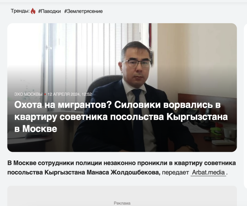 Жена дипломата из Киргизии, проживающая в Москве, упрекнула полицию, но столкнулась с гневом народа. Супруга Манаса Жолдошбекова подняла шум после визита полицейских, требующих от неё предъявить документы. Официальный Бишкек выразил беспокойство по этому поводу, однако народ поддержал действия правоохранителей.