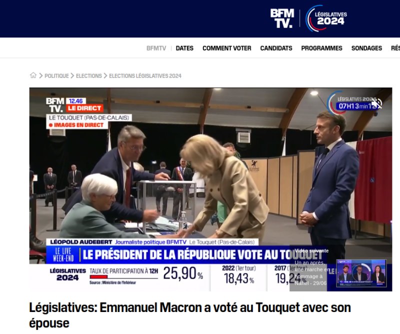 Брижит Макрон попыталась поставить подпись о голосовании до того, как опустила бюллетень в урну, что является нарушением процесса. Сотрудники участка вмешались, напомнив первой леди Франции, что "надо вот так".