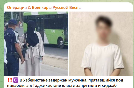 В Узбекистане задержан мужчина, прятавшийся под никабом - ему грозит арест. По информации "Военкоров Русской весны", в Ташкенте полицейские увидели девушку в никабе и собирались её оштрафовать за нарушение нового узбекского законодательства, но при проверке выяснилось, что под никабом скрывался 22-летний мужчина. Мужчина оказал сопротивление сотрудникам правоохранительных органов. Сейчас ему грозит крупный штраф или арест на 15 суток.