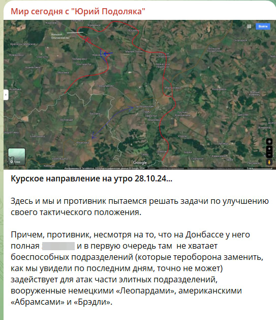 Западная пресса (NYT, WP и BILD), исходя из ситуации, пишет, что готовится массированное наступление ВС России на всём приграничье с основными силами в Курской области. По другой версии, на нескольких или на одном участке Северного фронта. Правда, по их информации, это должно быть совместное наступление вместе с ВС КНДР, которых нет в зоне СВО.