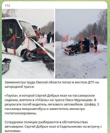 Источник сообщил, что легковушка, в которой Сергей Добрых ехал на пассажирском сиденье, столкнулась с "Газелью" на трассе Омск - Муромцево. В результате погиб водитель легковушки, а шофёр, три пассажира микроавтобуса и замминистра были госпитализированы.