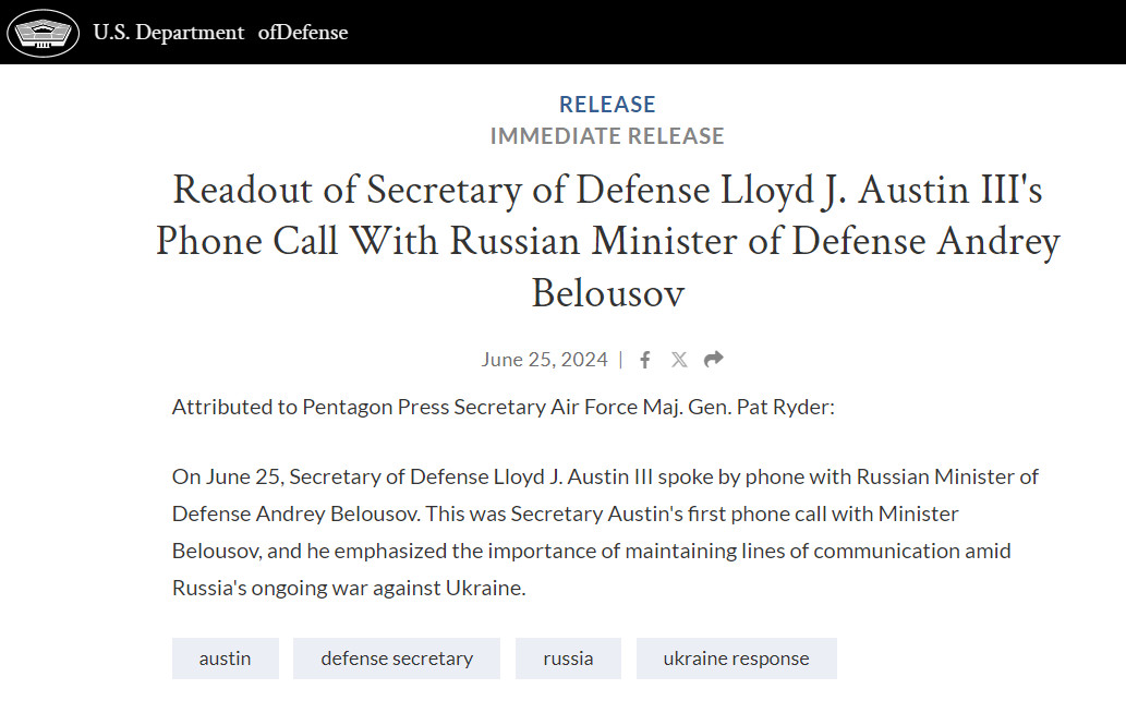 Министр обороны США поговорил по телефону с коллегой из России. Затронули тему Украины. Последний раз министры обороны России и США созванивались в марте 2023 года, когда российское военное ведомство возглавлял Шойгу. В ходе разговора Остин и Белоусов в том числе затронули тему Украины, сообщили в Пентагоне.