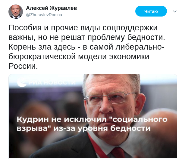 Ранее глава Счётной палаты Алексей Кудрин, рассуждая о бедности в России, не исключил "социального взрыва". Депутат Госдумы Алексей Журавлёв осадил его за это и прямо ткнул в "корень зла" - в "либерально-бюрократическую модель экономики России".