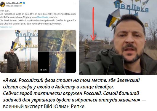 Юлиан Репке опубликовал в своих соцсетях сделанное в декабре селфи Владимира Зеленского. Рядом с селфи президента Украины журналист разместил свежее фото хроники военных событий четверга в Авдеевке.
