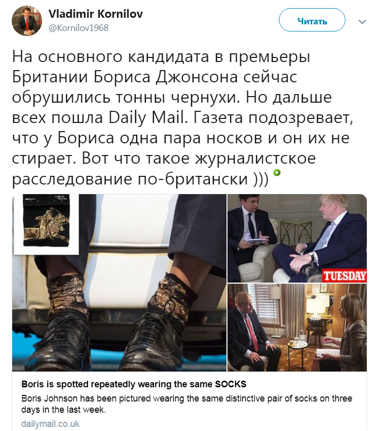 Британия выбирает премьера. Под прицелом прессы в такой ситуации находится каждый из кандидатов. Не обошли вниманием и фаворита гонки за премьерское кресло Бориса Джонсона, а точнее - его носки. "Вот такое расследование по-британски", отметил политический аналитик Владимир Корнилов.