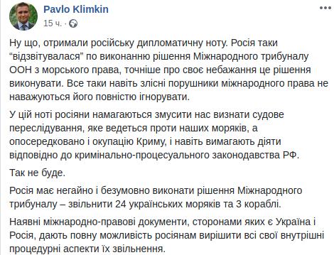 "Пытаются заставить нас признать судебное преследование, которое ведётся против наших моряков, а косвенно и оккупацию Крыма, - пишет украинский министр. - А также требуют действовать в соответствии с уголовно- процессуальным законодательством РФ. Так не будет".